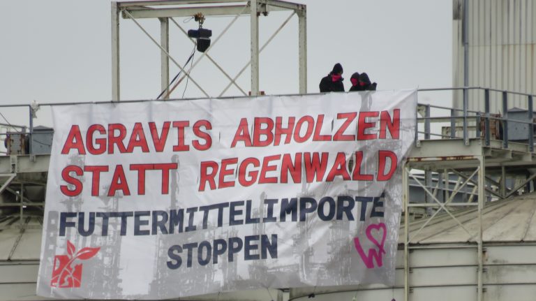 Disrupt. Food-System als Teil der internationalen Protestwoche 2025 fordert gerechtes Essen für alle und mit allen. Hochauflösende Fotos zur medialen Verwendung: Seit 09:30 Uhr werden Standorte der Fleischfabrik Könnecke in Delmenhorst und Reederei J. MÜLLER Weser GmbH & Co.…